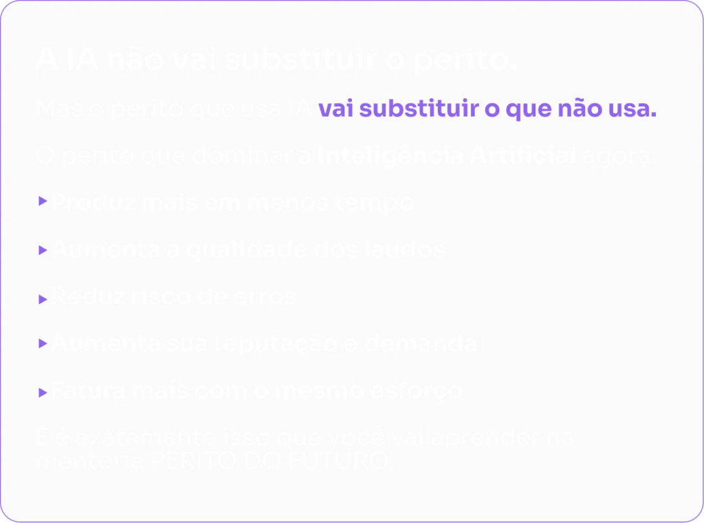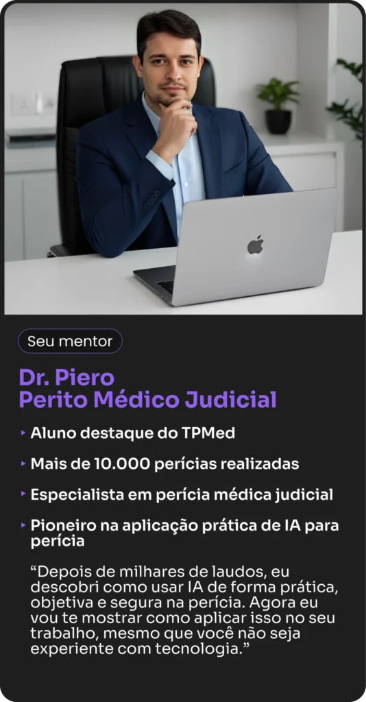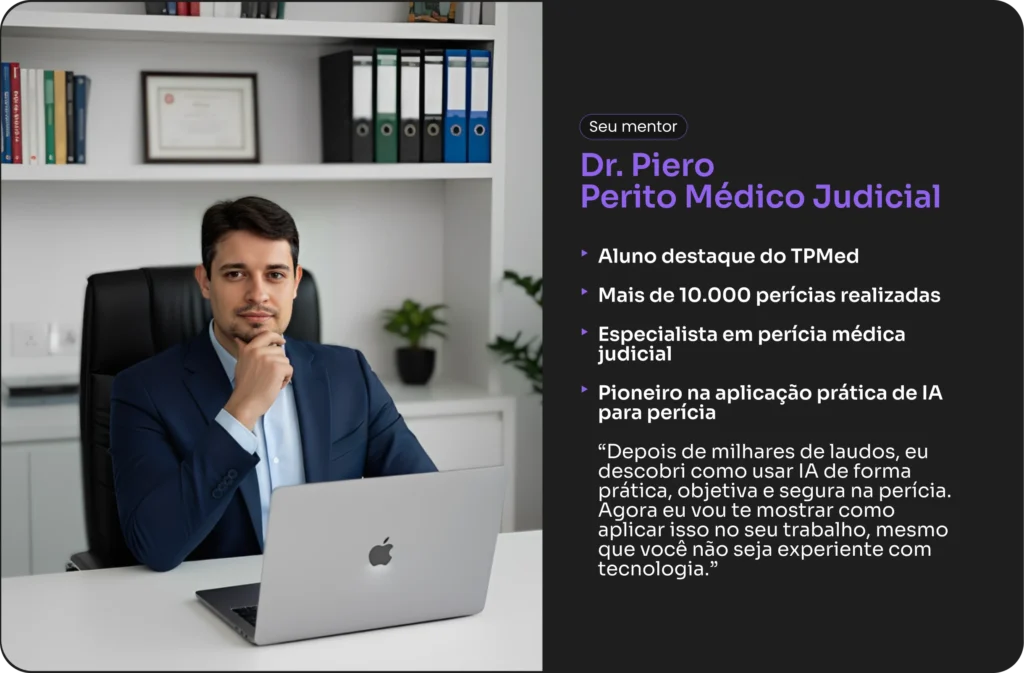 ✅ 6 encontros ao vivo com o Dr. Piero Serur, aprendendo como aplicar IA na perícia médica para aumentar produtividade e rentabilidade.
